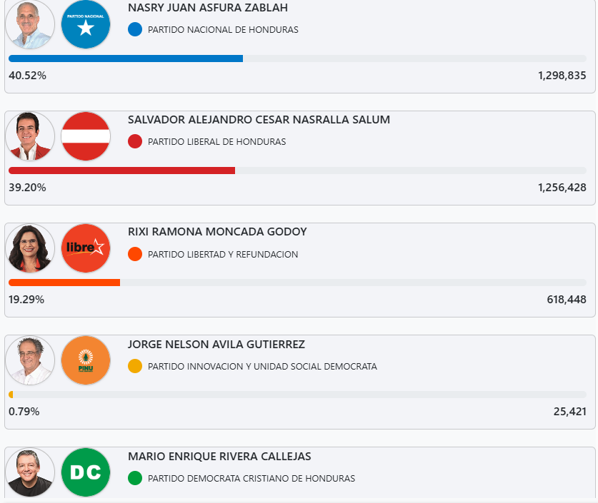 - Partido Nacional (Nasry Asfura): 1,391,989 votos (40.34%)