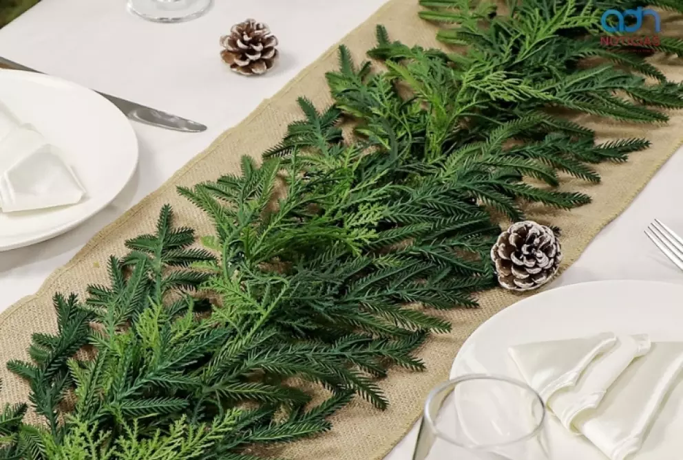La guirnalda verde ocupa el centro de la mesa y sustituye caminos textiles. Sus hojas aportan frescura, volumen y un aroma que refuerza la atmósfera festiva. La composición luce más rica si se añaden piñas, ramas delgadas o frutos rojos.