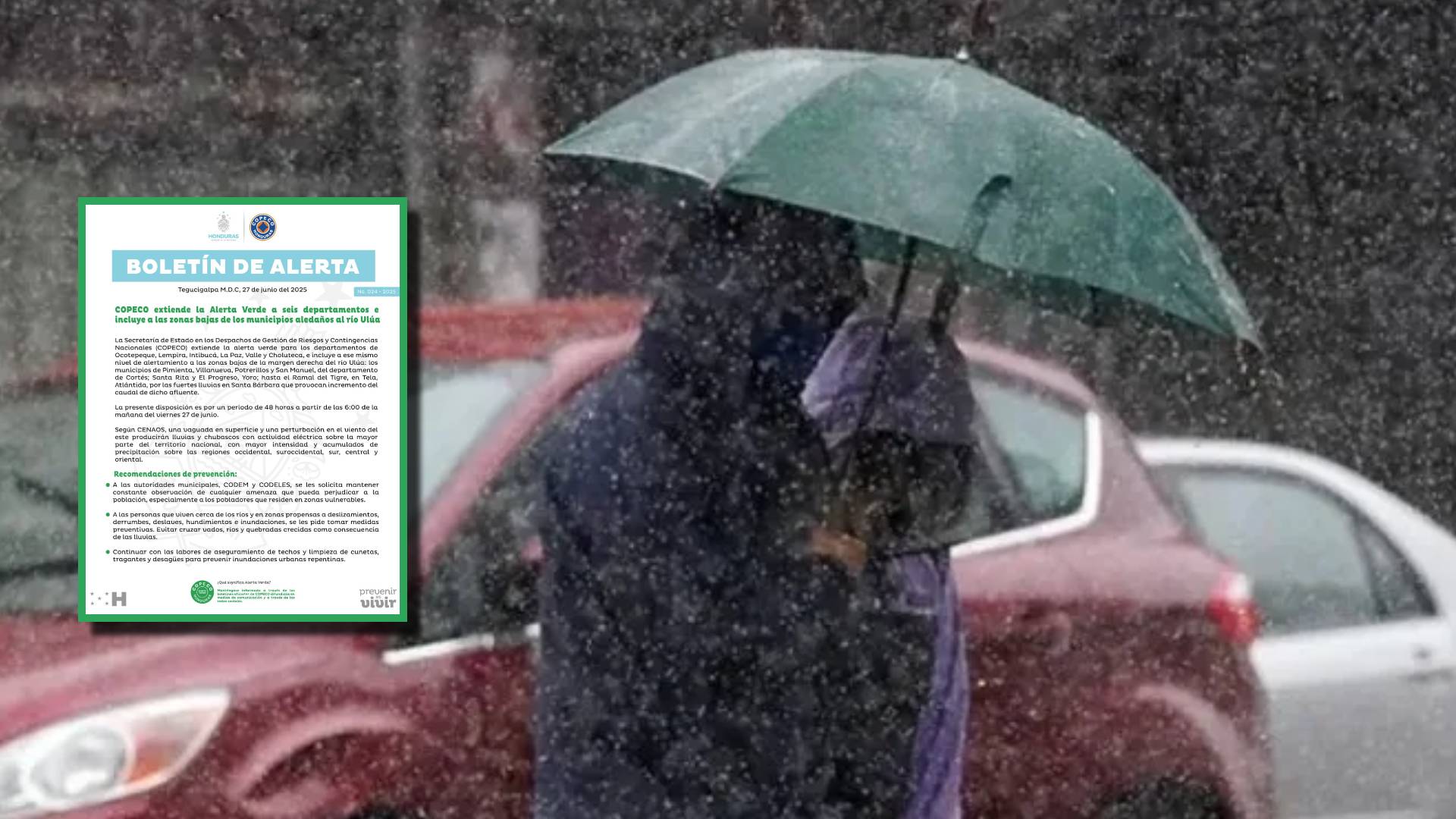 La Comisión Permanente de Contingencias (Copeco) declaró Alerta Verde por 48 horas para seis departamentos del país, debido al incremento de lluvias que podría provocar crecidas repentinas, deslizamientos e inundaciones en varias regiones vulnerables.