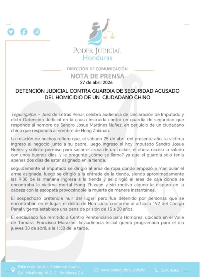 Tras el hecho, Sandro Josué Martínez fue detenido por las autoridades y presentado ante la justicia. Un juez ordenó detención judicial y su traslado al centro penitenciario de Támara, donde permanecerá mientras continúa el proceso legal.
