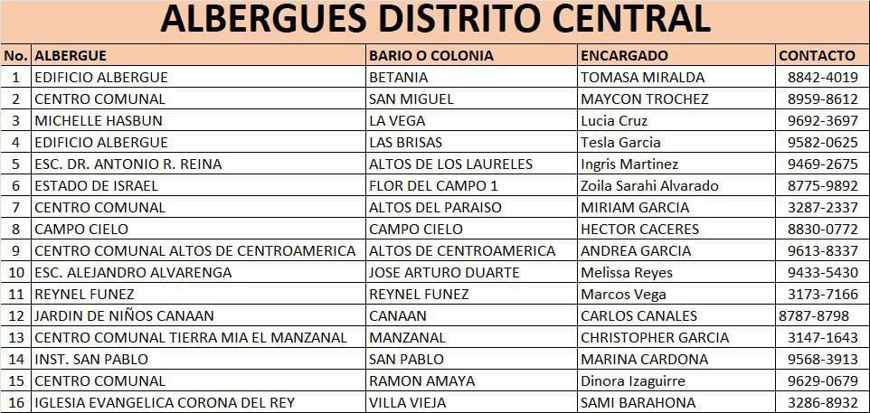 De acuerdo con la Alcaldía Municipal del Distrito Central (AMDC) los centros de refugio están distribuidos en barrios y colonias vulnerables, con encargados designados para coordinar la atención a los damnificados.