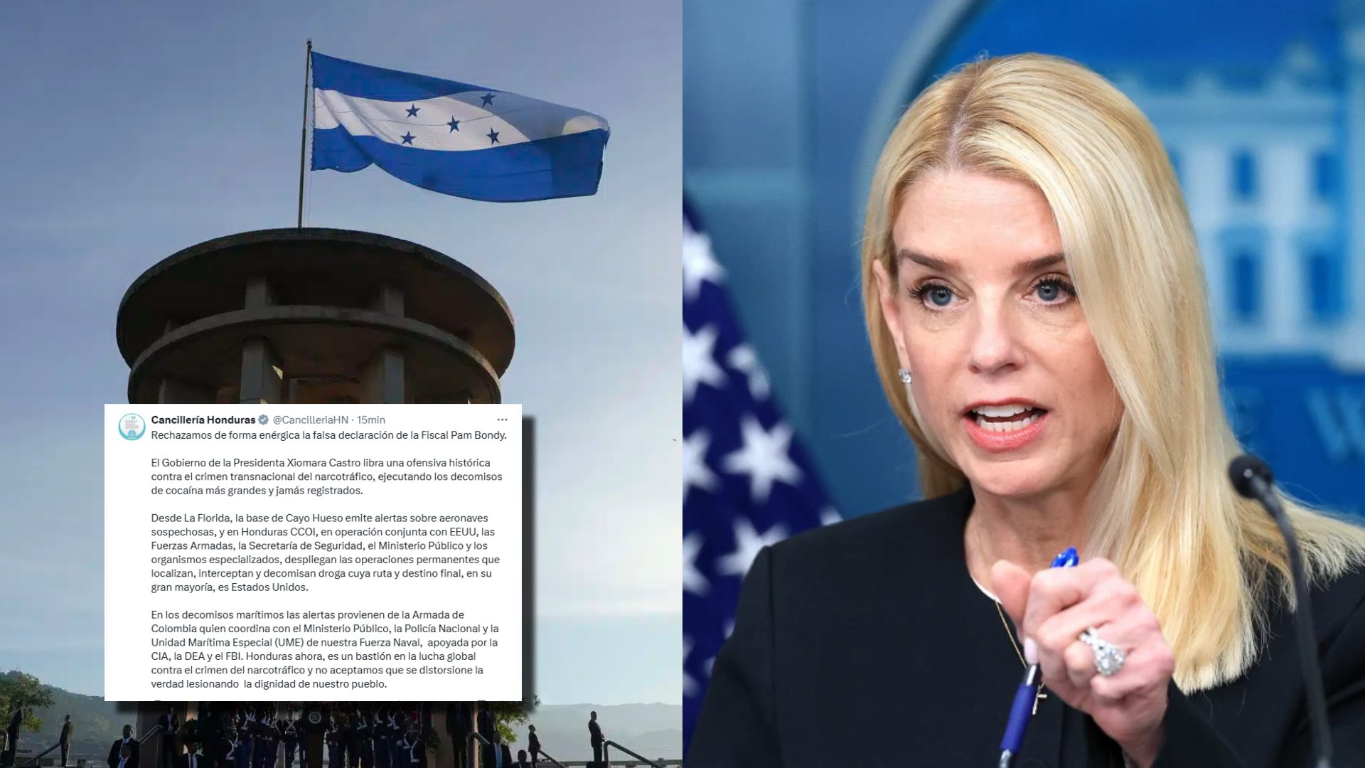 En una entrevista exclusiva, Bondi explicó que el espacio aéreo de Honduras formaría parte de una ruta que —según sus declaraciones— inicia en Venezuela y continúa hacia Guatemala y México, lo que facilitaría el traslado de estupefacientes sin ser detectados.