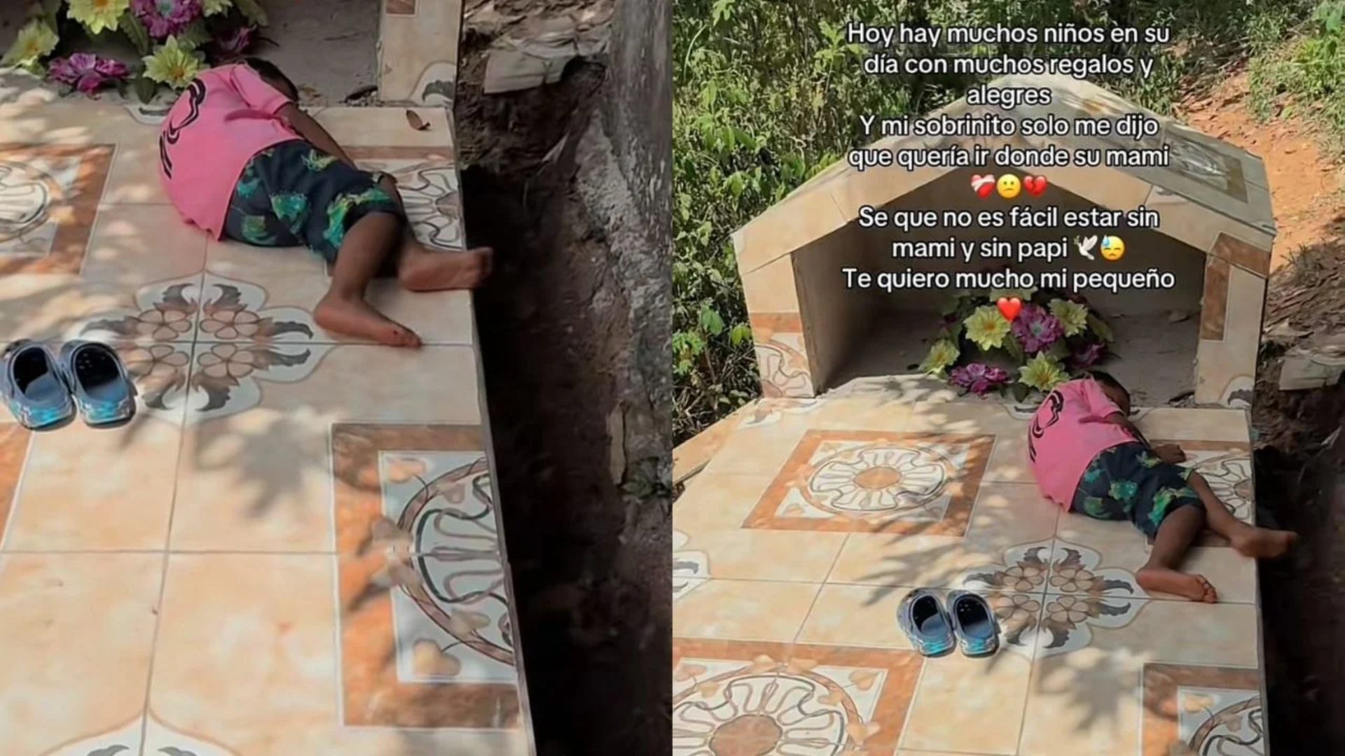Las imágenes muestran al menor recostado sobre la tumba de sus padres, una escena que refleja el profundo vacío que enfrenta a tan corta edad. El tío del niño, hermano de la madre fallecida, acompañó el clip con otra conmovedora frase: “Te extraño todos los días, hermanita”.