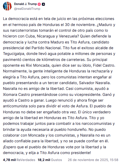 En su mensaje en la red social Truth, Donald Trump instó a respaldar a Nasry Asfura en las elecciones y acusó a los otros contendientes de impulsar un “avance comunista”.