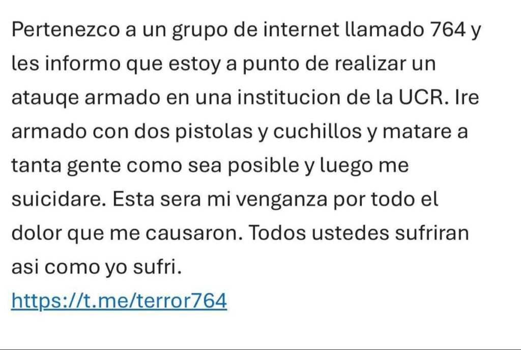 Según el contenido del mensaje que ha trascendido en las últimas horas en las redes sociales, su autor —que se identificó como miembro de un grupo de internet— declaraba su intención de perpetrar un ataque armado en una sede de la UCR, alegando llevar armas y buscar venganza, para luego suicidarse.